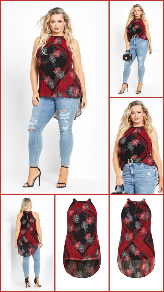 Ignite your style in the red Halter Pleat Print Top! Its alluring halter neckline, all-over pleated detail, and single button back closure make a bold statement. The hi-lo hemline and relaxed silhouette ensure both comfort and fashion, while the partial lining adds a hint of allure to this fiery piece.